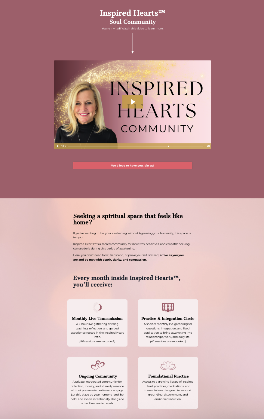 Potential members first arrive at a spacious, energetically aligned landing page inviting them into the Inspired Hearts community—designed to feel welcoming, grounded, and resonant with the depth of the work.