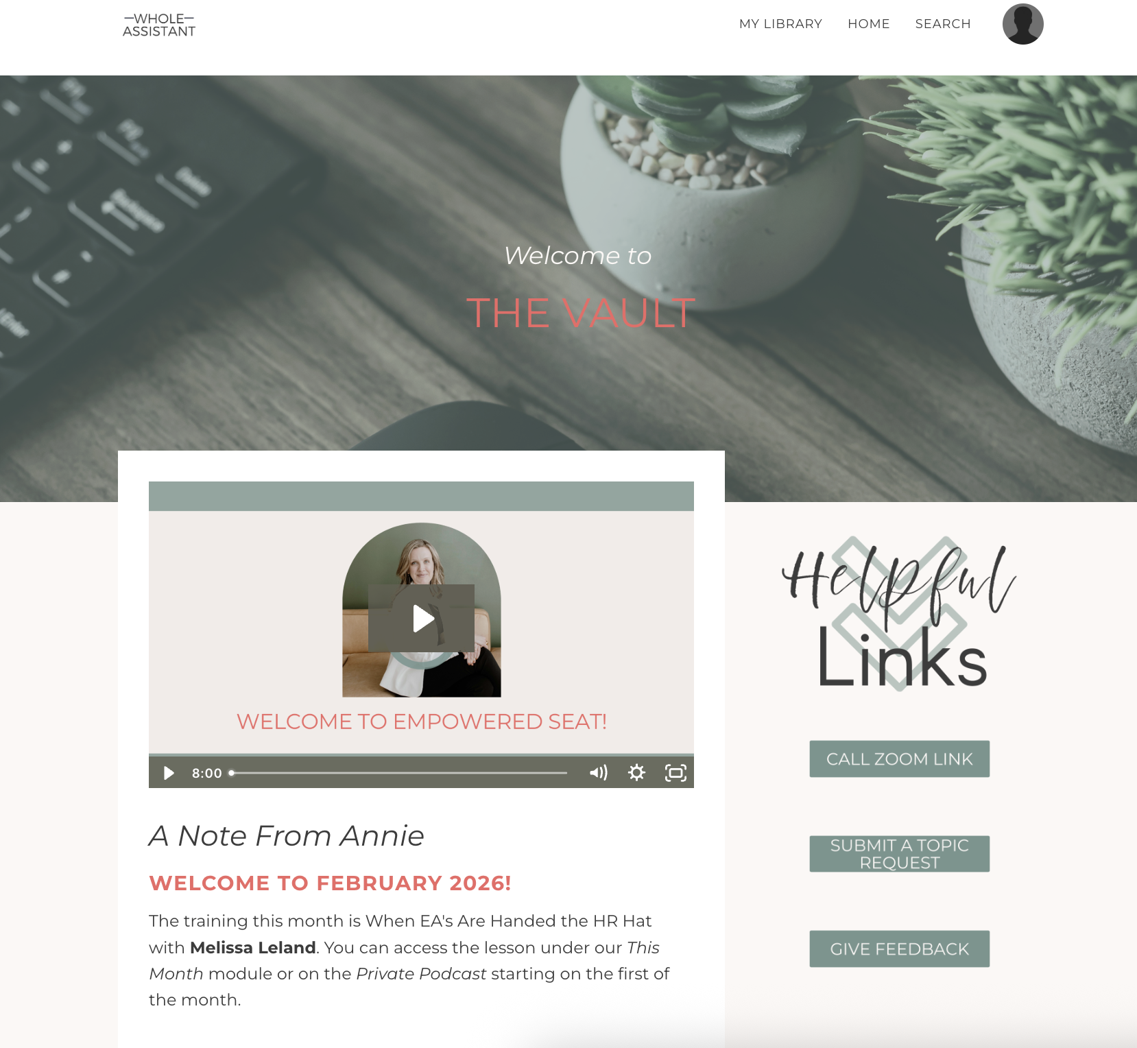 Whole Assistant’s Empowered Seat is a human-centered coaching program and membership space for Executive Assistants and Administrative Professionals. The program blends mindset coaching, practical tools, and community connection to support EAs in stepping into their value, strengthening their voice, and showing up as true strategic partners in their roles.