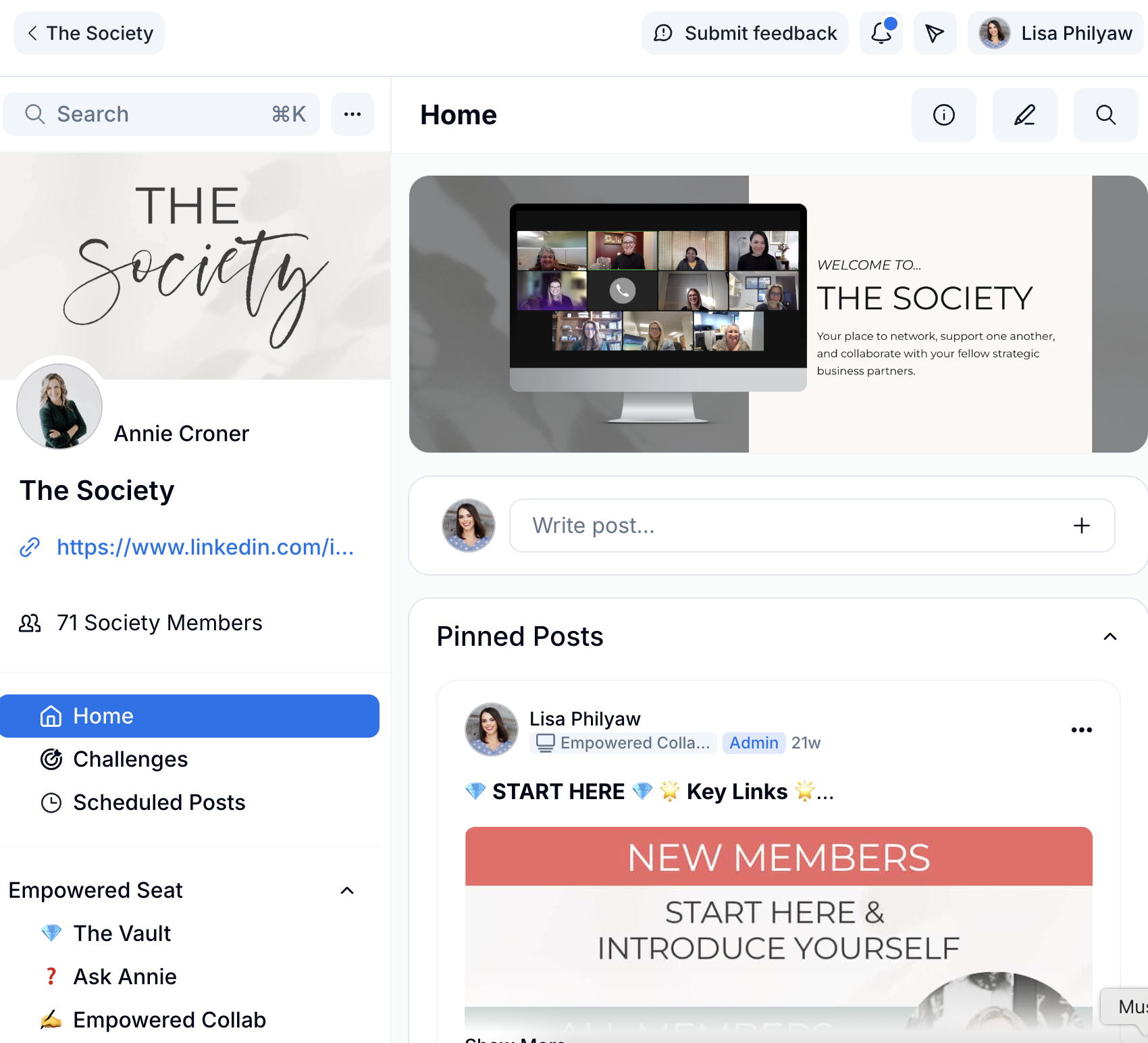 Here are screenshots of The Vault (Kajabi Course) and The Society (Kajabi Community) that support this membership experience.