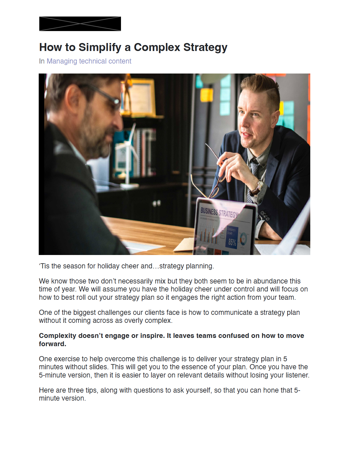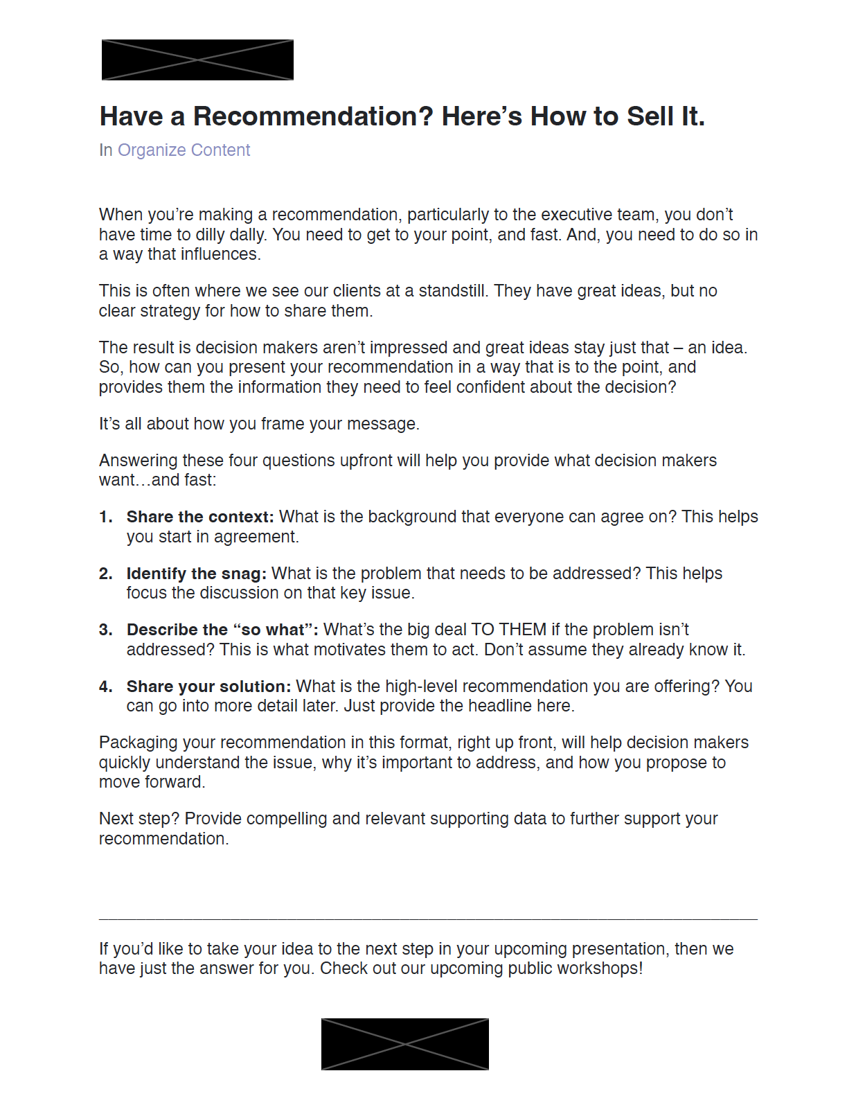 I wrote the monthly communications newsletter during my time working at a presentation skills consulting company. This newsletter went out to all employees, contractors, and clients of the company. Knowing thousands would be receiving each message, my goal was to create easy to digest communication tips to help readers immediately apply the content. This would ensure they received value and would think of us for their communication needs. Below are samples of these newsletters.