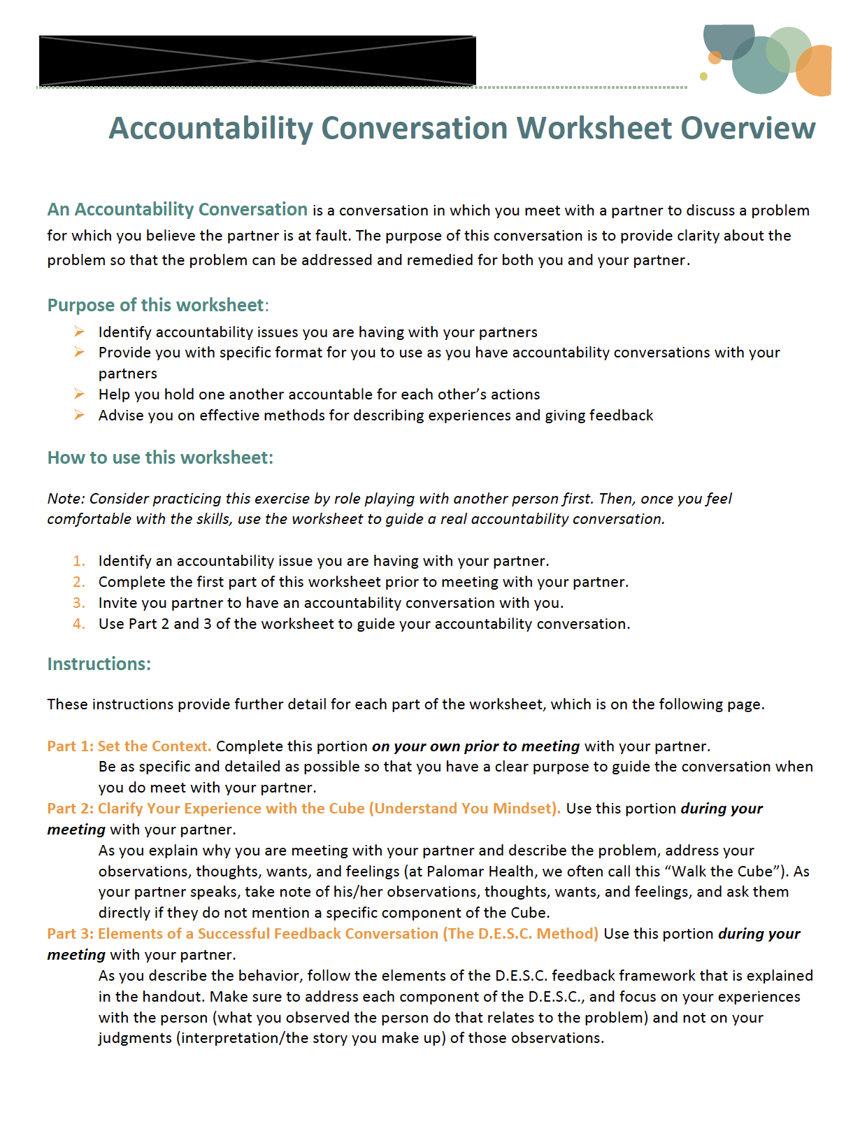 While working at a public hospital, I developed on-demand physician leadership training modules using Articulate Storyline. Although the modules themselves are confidential, below I’ve provided work samples of the accompanying resources that went with portions of the training. The Learning Workbook: Module 1 sample offers physicians a printable resource of the key content and reflection questions from the first module of the on-demand program. The Accountability Conversations worksheet provides an example of one of the worksheets used within the training.